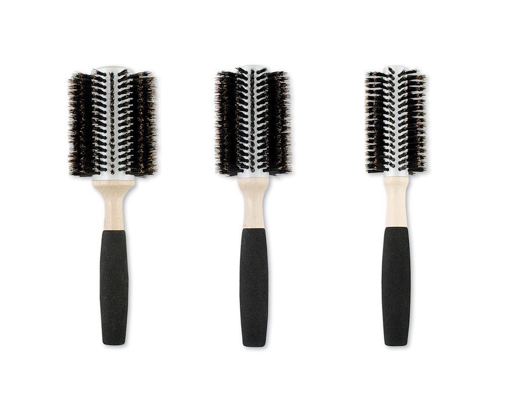 Natural Maple wood with black foam grip handle. Silver ceramic thermal barrel and 100% pure boar bristles.