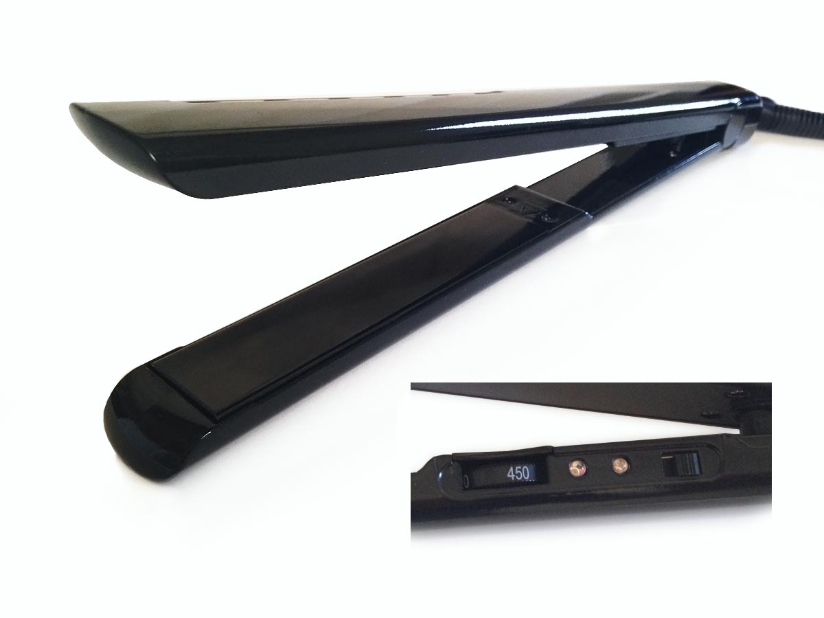 1" professional flat iron with adjustable temperature control up to 450 degrees, 9-1/2 foot UL swivel cord; Ceramic tourmaline plates which create a shinier, silkier finish in less time, and steam release vents. Available in Black.